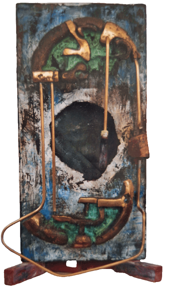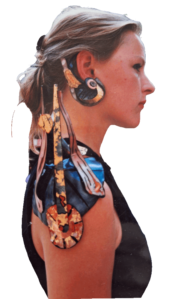 sieraden van kunststof in combinatie met brons en Bladgoud (werk van Gertjan uit 1992)